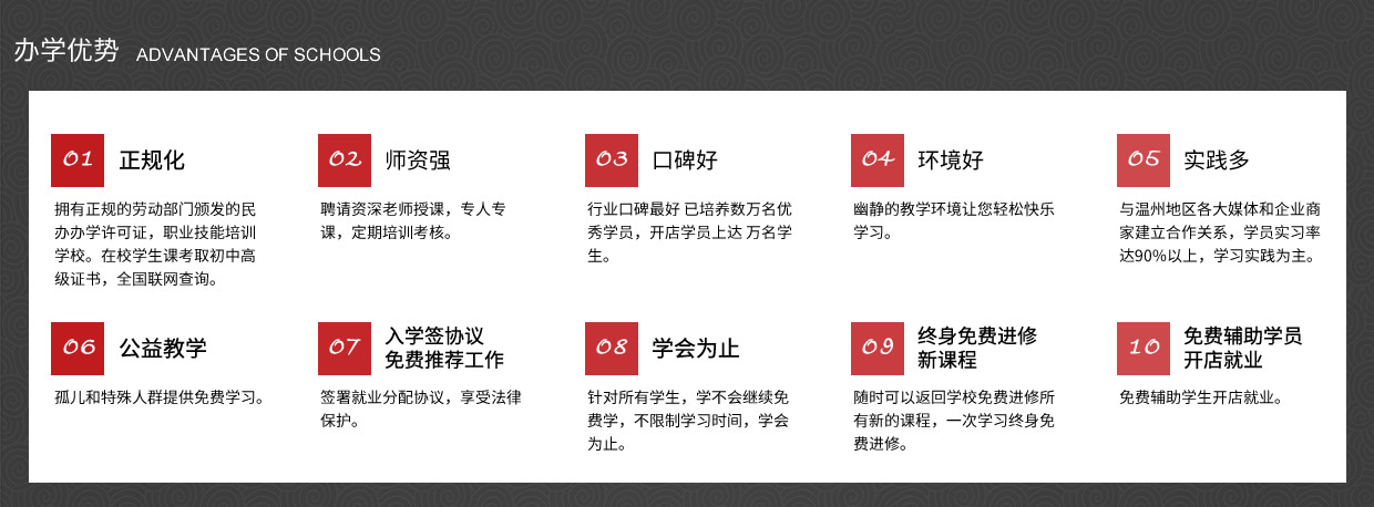 我校以培養(yǎng)實用型專業(yè)人才為目標(biāo),理論學(xué)習(xí)、操作訓(xùn)練與專業(yè)實踐三位一體,實行一對一的教學(xué)模式,常年招生,男女不限。畢業(yè)后推薦工作、 主要是以理論為輔實操為主的教學(xué)模式授課。老師手把手教、一對一輔導(dǎo),為學(xué)員量身定做課程,保證學(xué)會為止、 中途不收取任何費(fèi)用,(無任何隱形消費(fèi))進(jìn)修新的課程。、簽約教學(xué)、幫助學(xué)員開店就業(yè),免費(fèi)試學(xué)(讓您全方位的體驗我們的專業(yè)、讓你不花一分冤枉錢。)